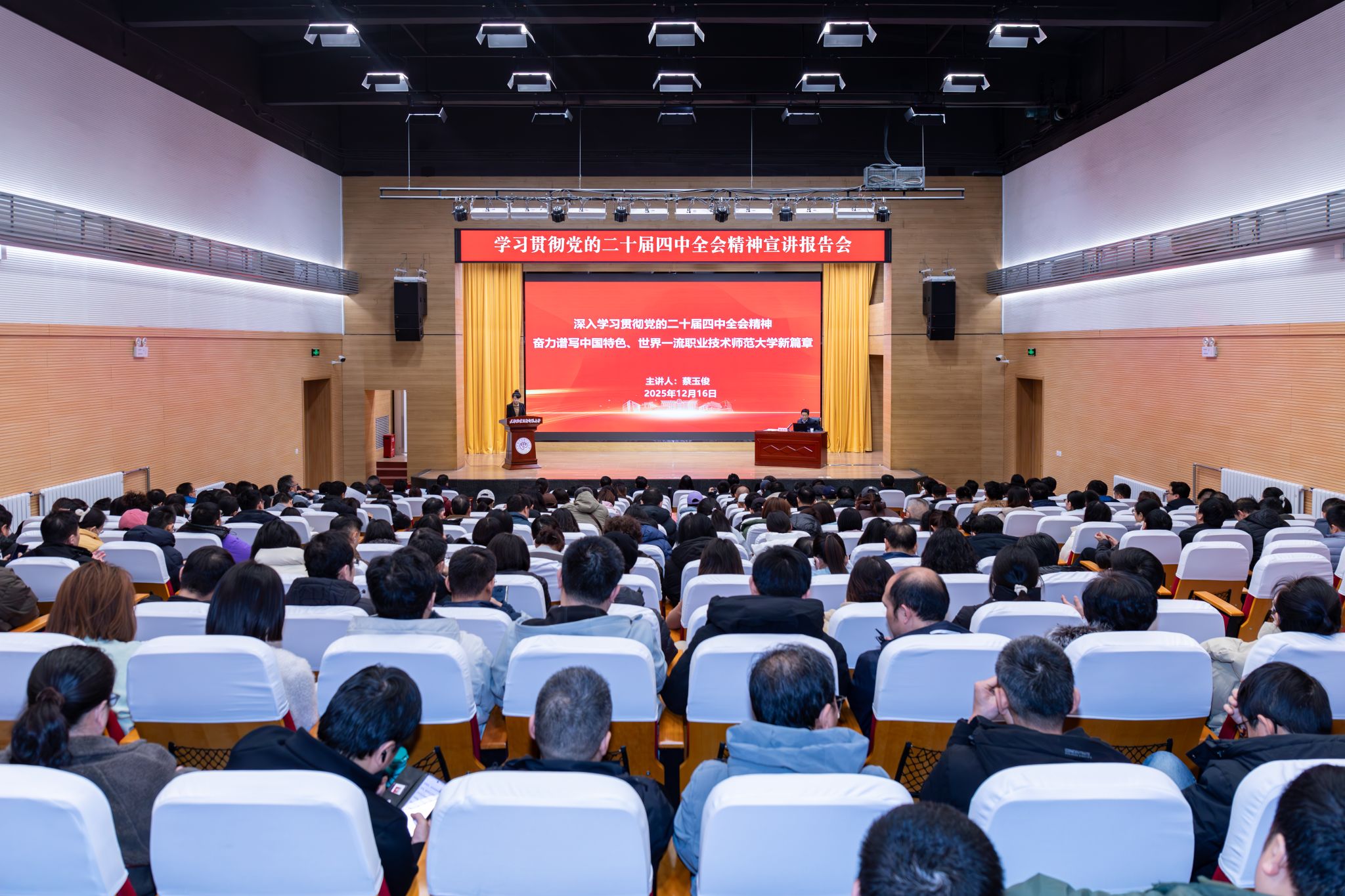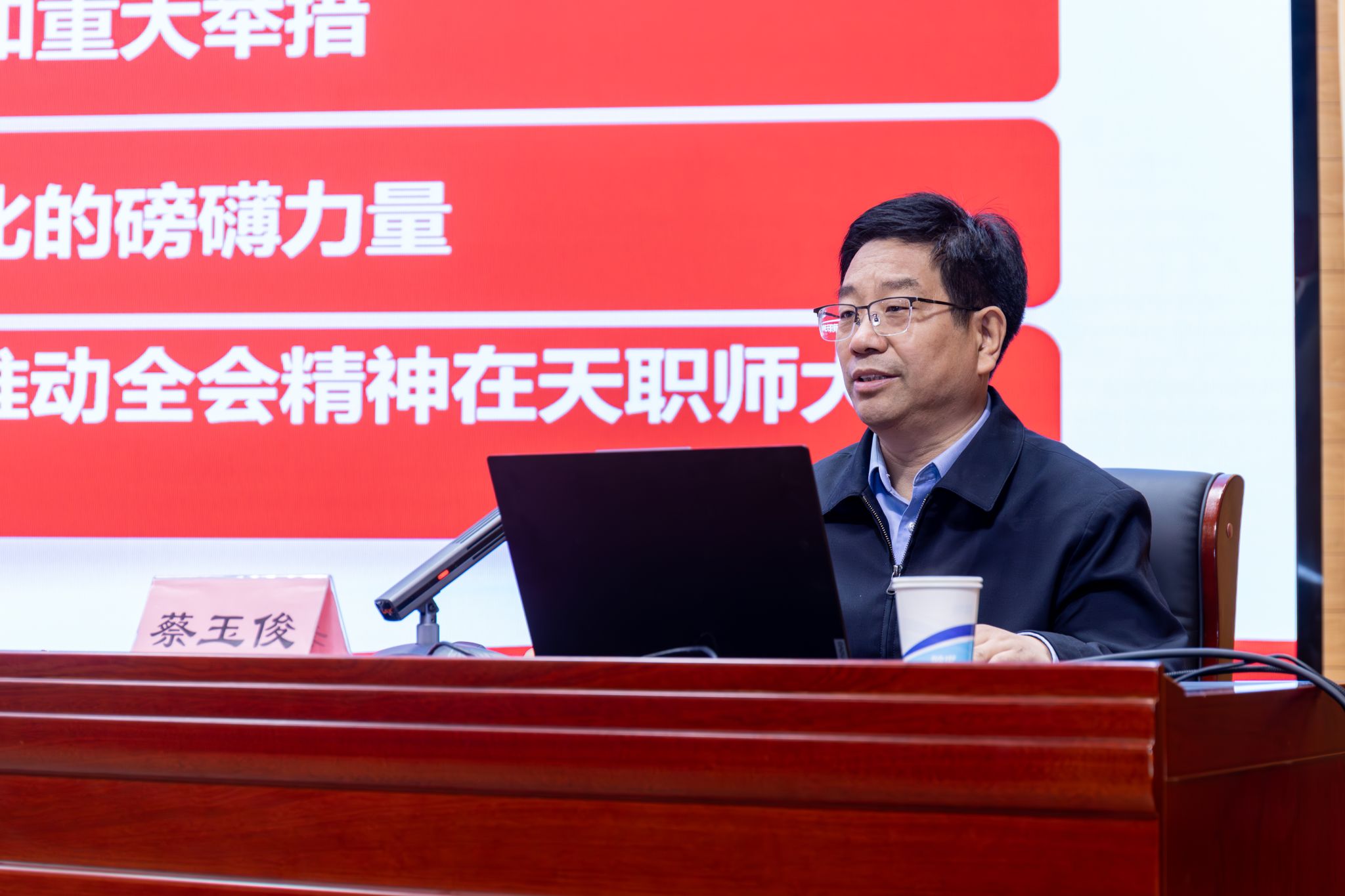 蔡玉俊对深入贯彻落实全会精神提出明确要求。一是要提高政治站位,把学习宣传贯彻全会精神作为当前和今后一个时期的首要政治任务,迅速兴起学习热潮,推动全会精神进校园、进课堂、进头脑。二是要锚定发展坐标,准确把握全会关于统筹教育强国、科技强国、人才强国建设的总体要求,将学校发展融入国家战略和区域发展大局,科学谋划学校“十五五”时期发展蓝图。三是要强化使命担当,深化教育教学改革,把全会精神有机融入人才培养全过程,着力培养担当民族复兴大任的时代新人。四是要狠抓工作落实,以全会精神为指引,扎实推进学校重点工作,破解发展难题,凝聚奋进力量,为建设中国特色、世界一流职业技术师范大学而不懈奋斗。