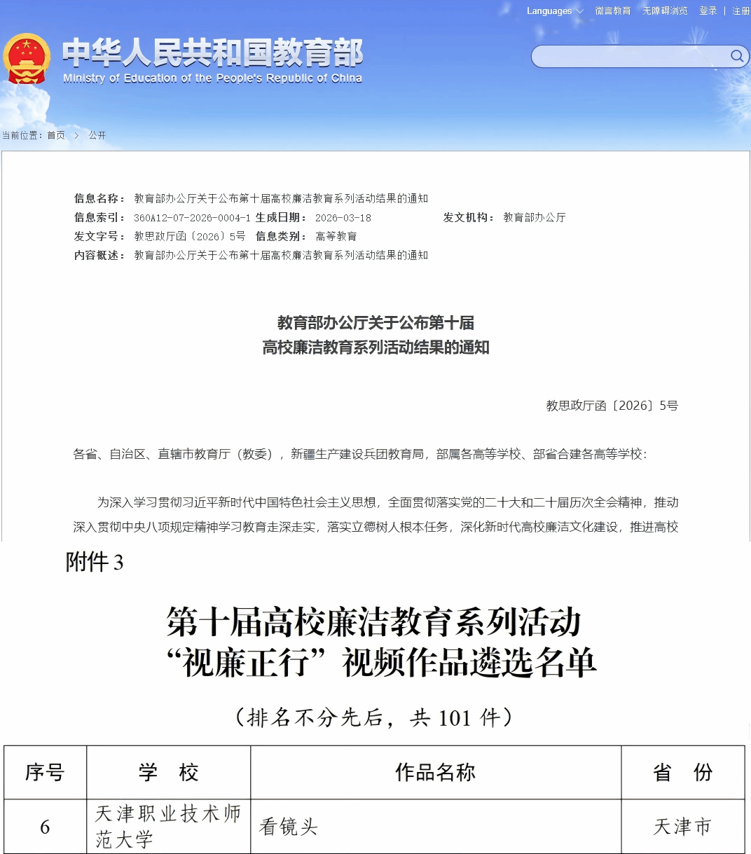 本次活动由教育部思想政治工作司主办,以“清风育德守初心 廉洁笃行担使命”为主题,面向全国全日制普通高等学校教职工和在校学生开展,旨在深化新时代高校廉洁文化建设。作品经高校申报、省级推荐、专家评审等多环节严格遴选,我校作品的成功入选,充分体现了教育部对我校廉洁文化建设工作的认可,也是学校坚守立德树人根本任务、持续推进新时代高校廉洁文化建设的重要成果。