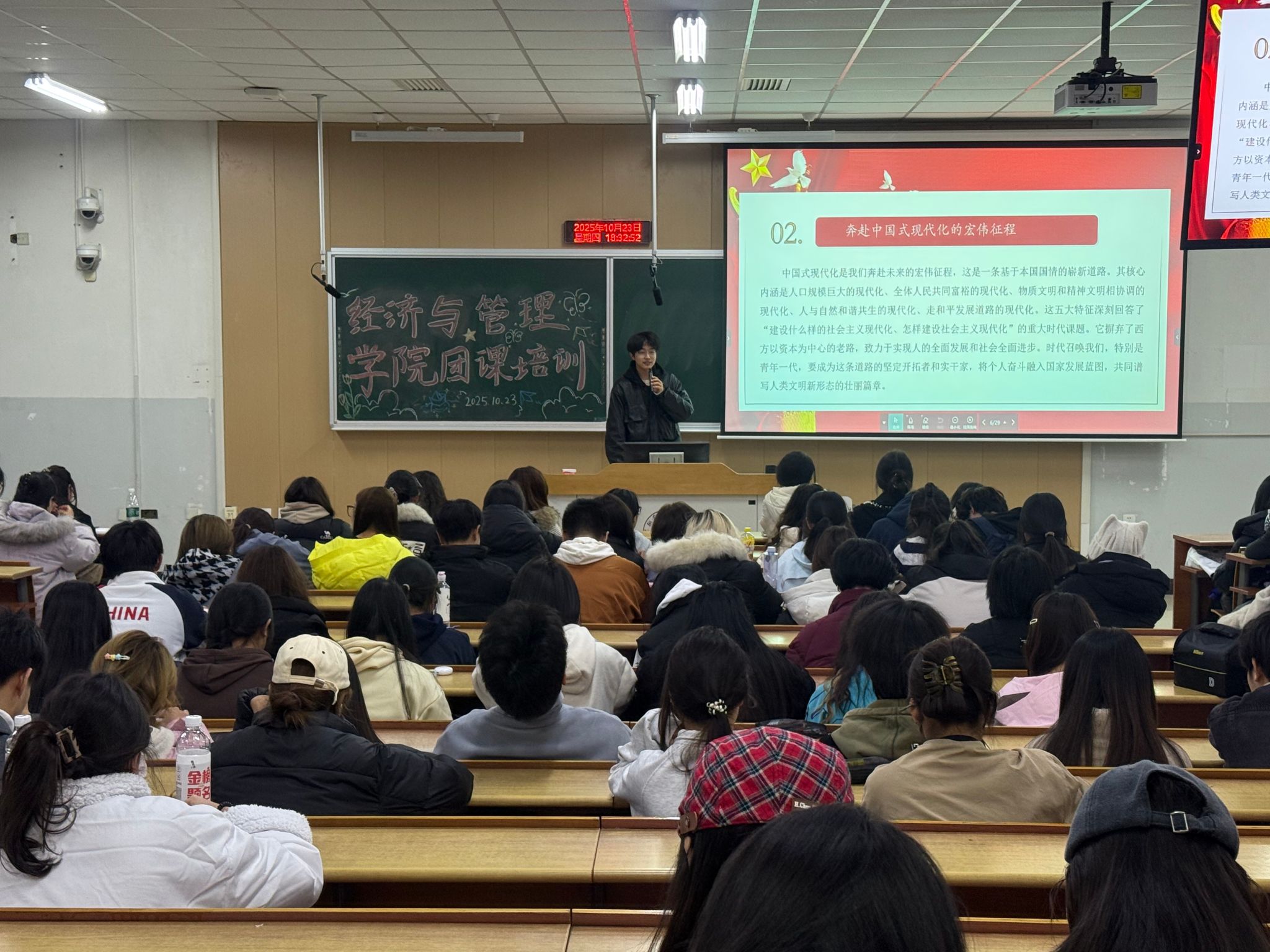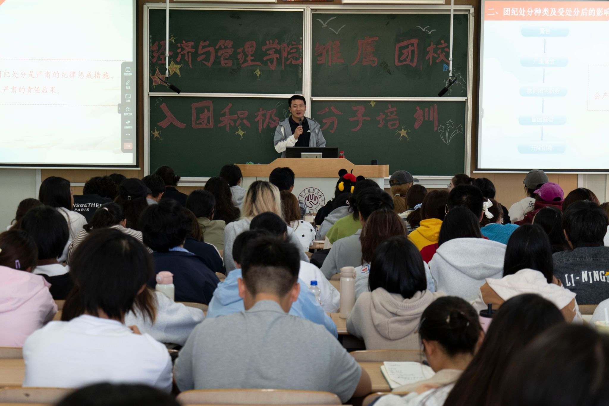 为深入贯彻落实共青团组织建设工作要求,切实加强对入团积极分子的思想引领和组织培养,动员引导广大入团积极分子在以中国式现代化全面推进强国建设、民族复兴伟业中挺膺担当,10月14日至24日,经济与管理学院在第三教学楼开展“雏鹰团校”入团积极分子系列培训。学院团委书记闫丹、马克思主义学院教师武培培、辅导员殷天皓、优秀共青团员代表李春滔、优秀学生干部代表蒋明霖为130余名入团积极分子展开培训。