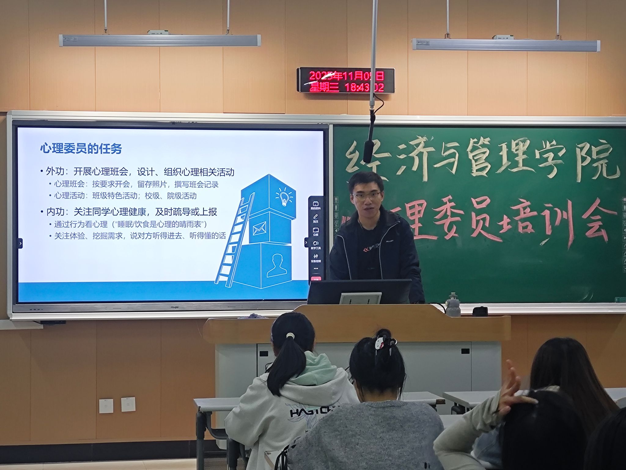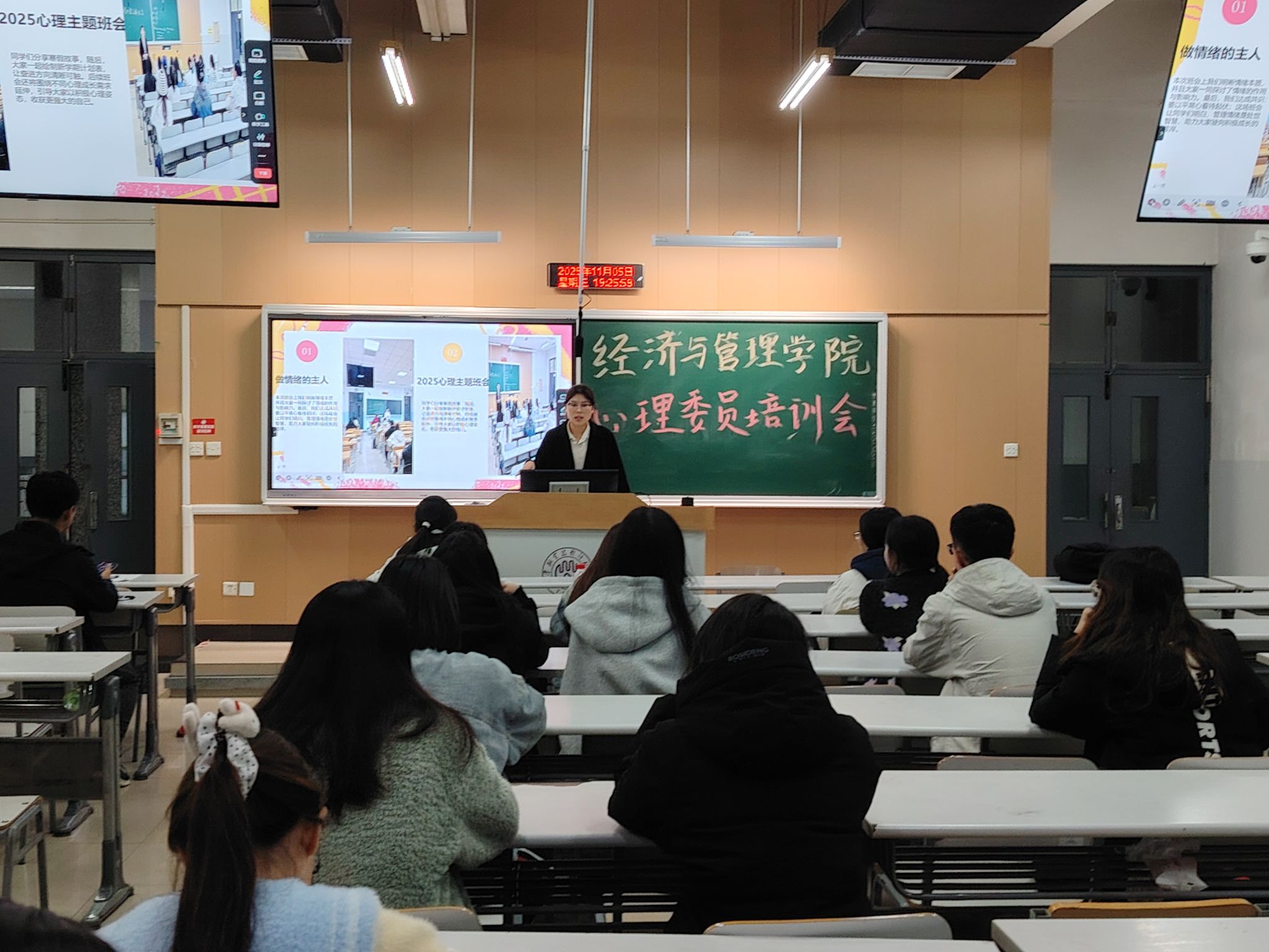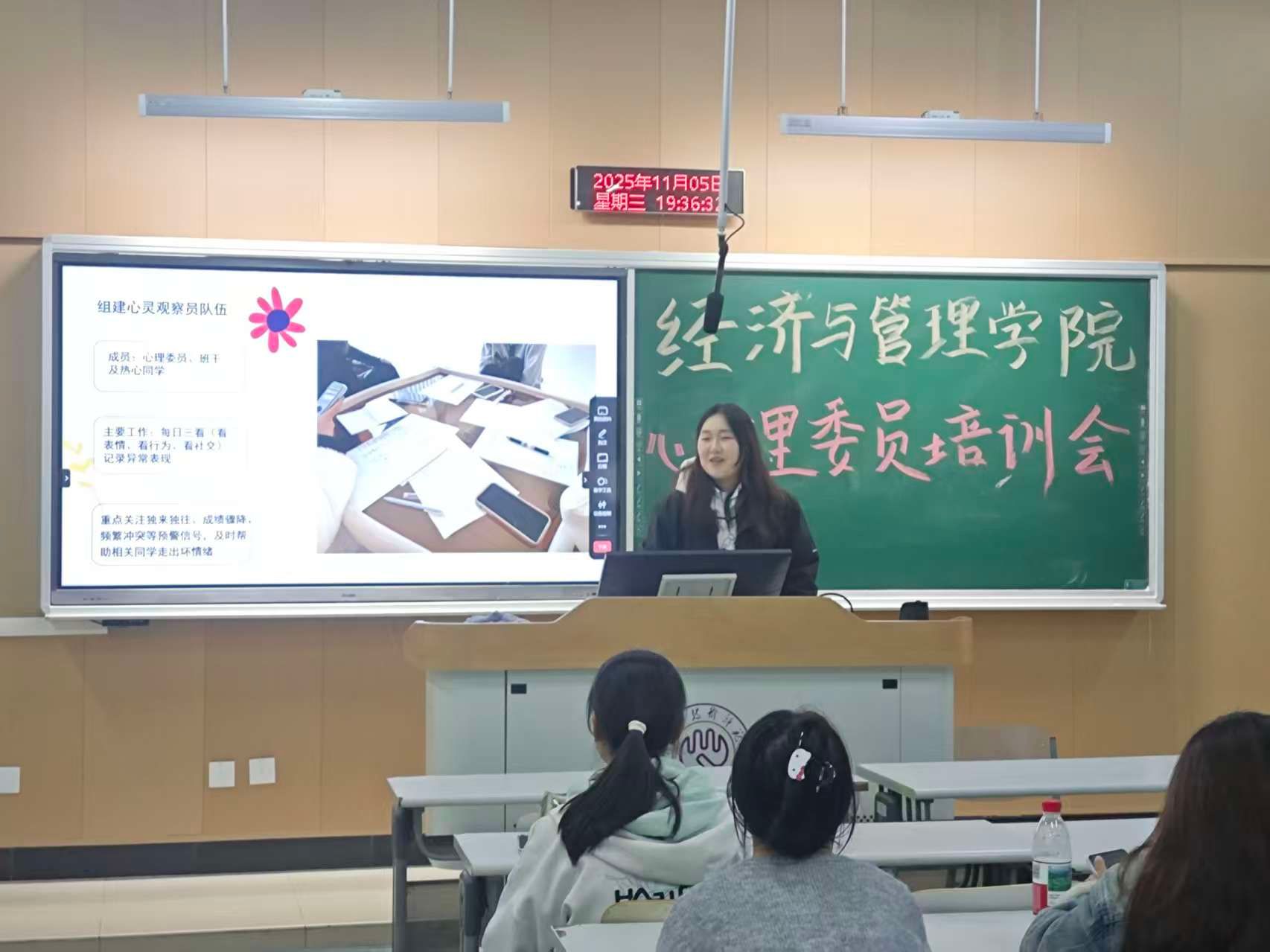为进一步夯实学院心理健康教育工作基础,提升心理委员的专业素养与履职能力,筑牢学生心理健康安全防线,11月5日,经济与管理学院举办心理委员工作培训暨心理“达标”“示范”班建设经验交流会。25级全体新生心理委员及高年级心理委员代表参会。会议由学院辅导员刘欣宇主持。