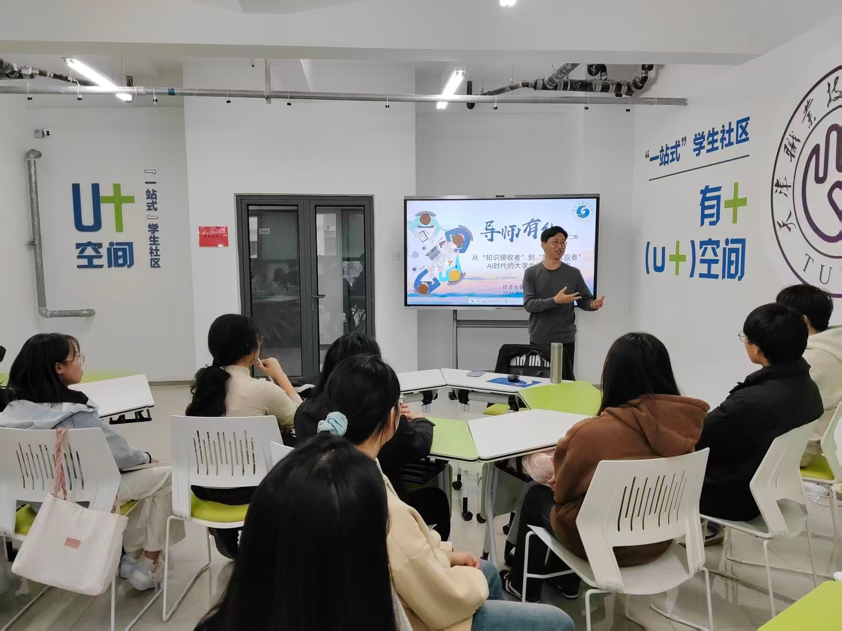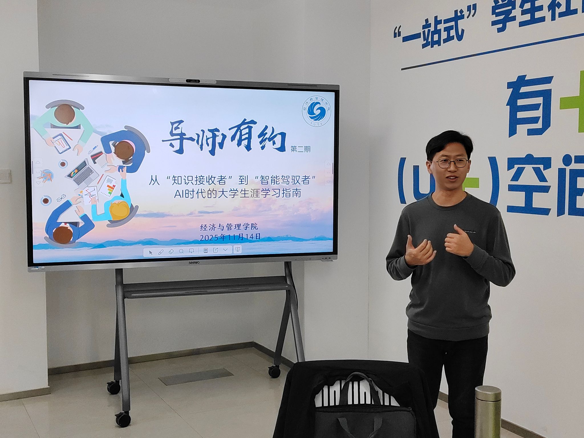 为帮助经济与管理学院学子把握AI时代学习规律,明确大学生涯发展方向,11月14日,经济与管理学院在东区U+空间举办“导师有约”活动第二期。物流管理系主任付强老师以 “从‘知识接收者’到‘智能驾驭者’——AI 时代大学生涯学习指南”为主题,为在场学子带来了一场兼具深度与实用性的精彩讲授。