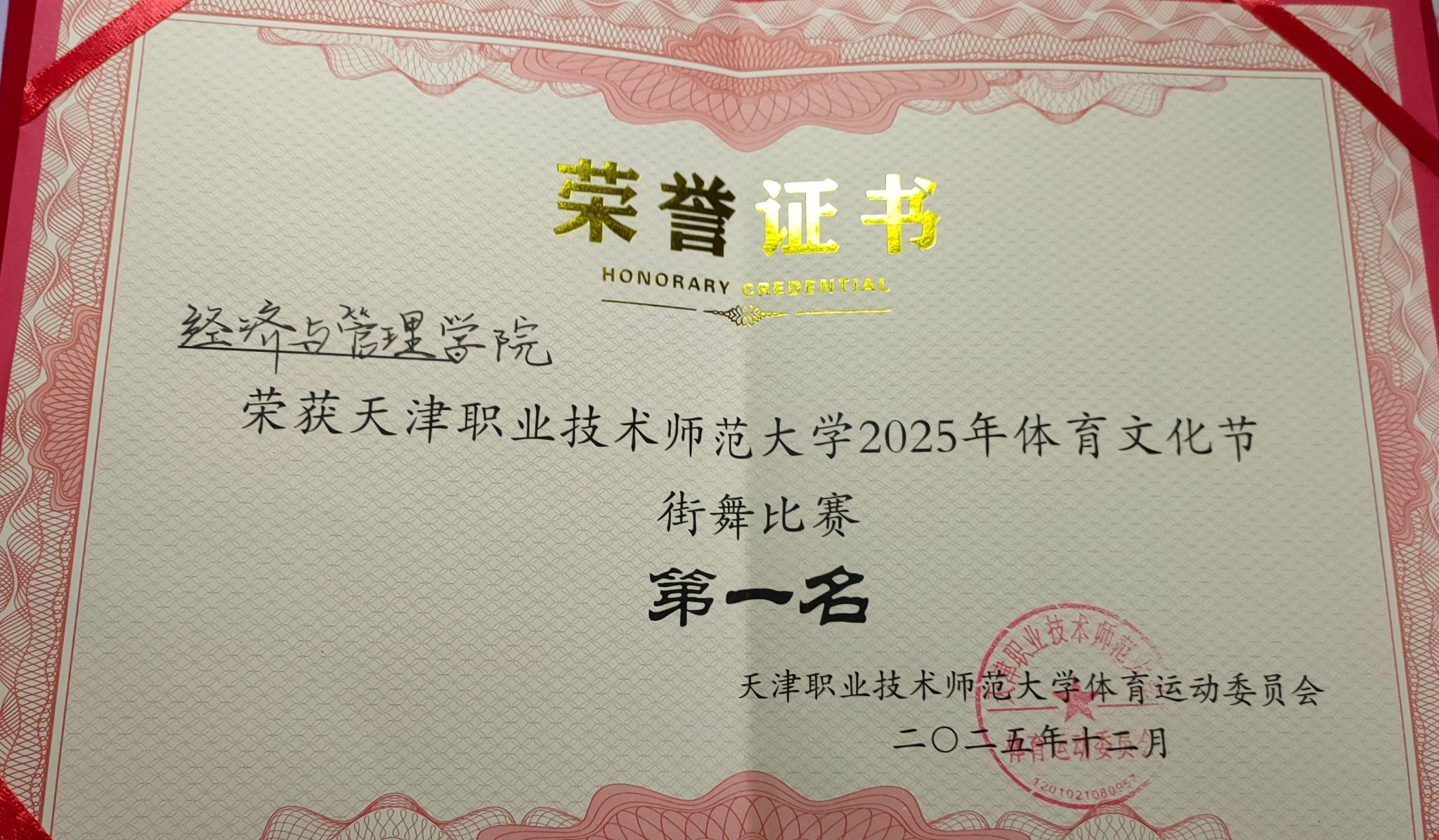 12月11日,天津职业技术师范大学2025年度体育文化节系列活动之街舞比赛在学校体育馆燃情落幕。经济与管理学院街舞队凭借精准有力的动作、默契十足的配合与富有感染力的舞台表现,从全校八支参赛队伍中脱颖而出,成功斩获街舞比赛一等奖,为学院在本届体育文化节的征程画上了圆满的句号。