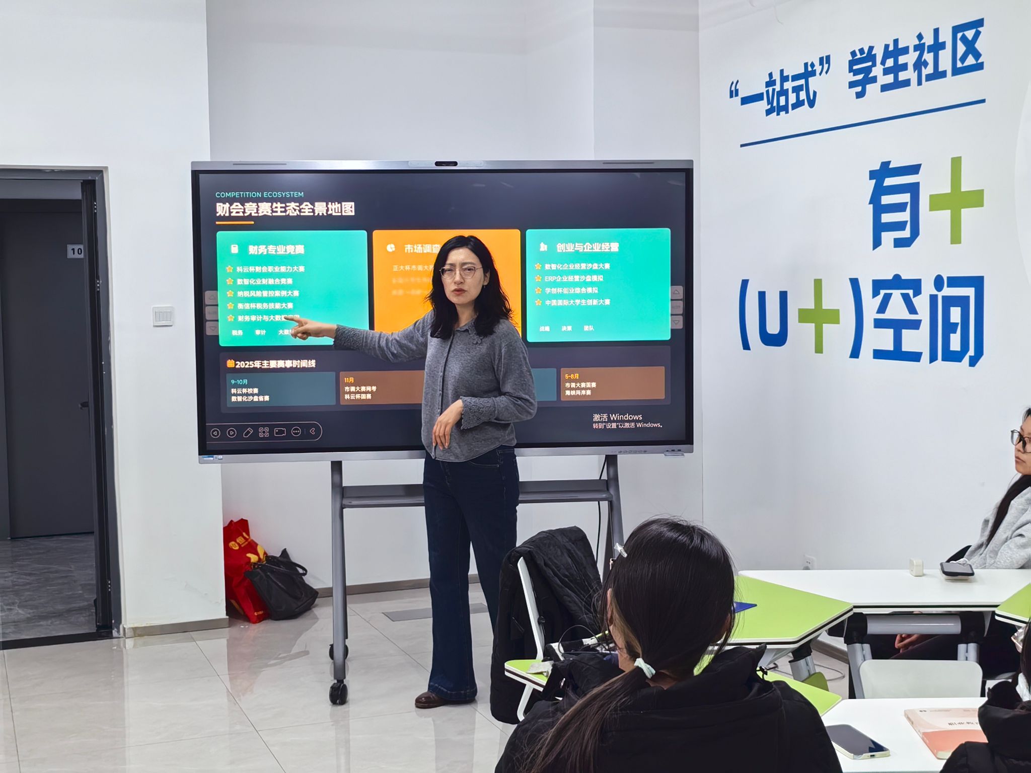 活动中,隋杰老师围绕“竞赛的价值与意义”“适合的竞赛类别”“备赛策略与获奖技巧”三大核心板块展开详细讲解。她指出,竞赛带来的核心价值远不止荣誉本身,更能实现专业能力的系统强化,涵盖财务机器人、BI工具、Python应用等前沿技能,对接行业数智化转型需求,同时帮助学子深度洞察行业动态,与全国优秀同行交流切磋。随后,隋杰老师全面梳理了财会专业核心赛事生态,并针对每类赛事,详细介绍了赛制规则、考察重点、赛程安排,并分享了我校学子在相关赛事中斩获全国及省市级多项荣誉的成功案例,为同学们提供了鲜活的参考范例。在备赛技巧分享环节,隋杰老师从组队分工、时间规划、选题策略、报告撰写到答辩技巧进行全方位指导,并结合企业招聘评分标准,说明竞赛经历对提升综合素养、专业能力、沟通协调能力等核心要素的重要作用,让同学们明确了竞赛与职场发展的紧密关联。