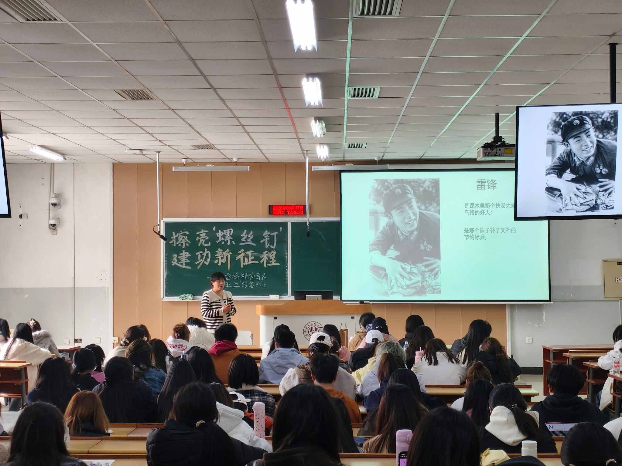 团课还结合当前大学生中流行的“内卷”与“躺平”现象,提出雷锋精神给予青年的启示:与其在焦虑中内卷,不如在自己选择的领域深耕;与其在迷茫中躺平,不如在平凡中坚守。武培培鼓励学生要具备“钻劲”“韧劲”和“热劲”,在时代大潮中找到自己的位置,用专业能力服务社会,实现个人价值与社会价值的统一。