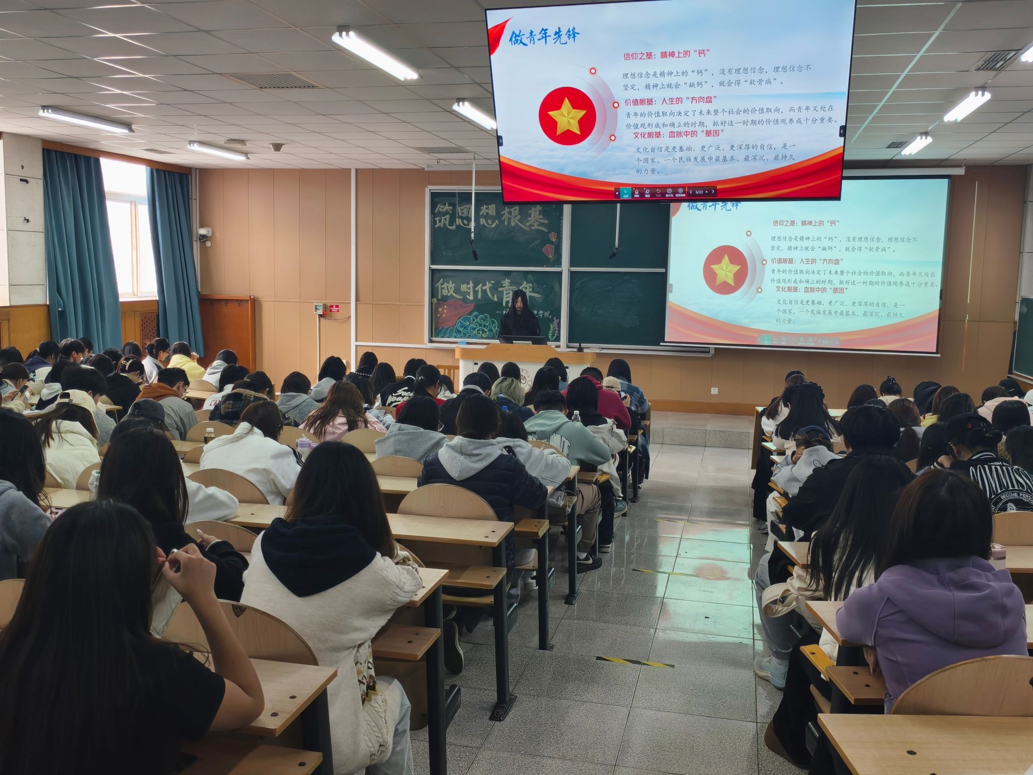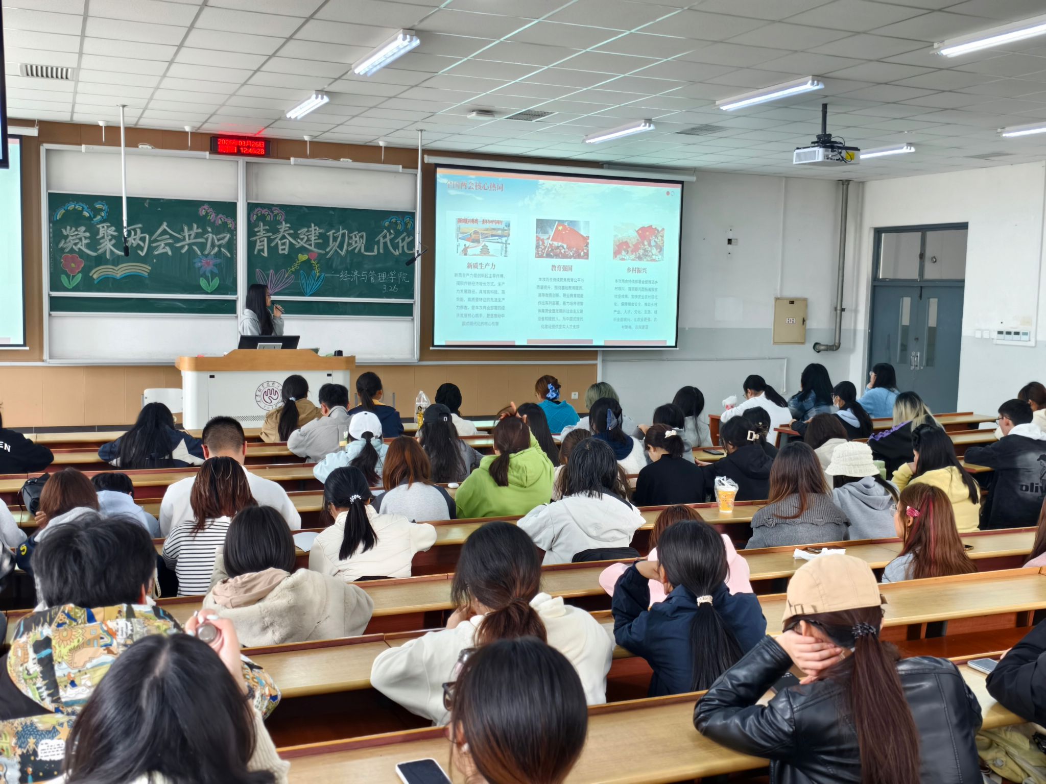 3月26日,团课在第三教学楼108教室举行。团委书记闫丹老师首先对入团积极分子进行集中教育,勉励大家发挥表率作用,以饱满热情领悟两会精神。随后,财会2301班杜语谦同学为150余名入团积极分子带来专题分享。她从“时代的召唤”切入,结合2026年全国两会作为“十五五”规划关键之年的重要背景,用农业发展、科技创新、经济建设等数据展现国家前进步伐,帮助同学理解两会精神是青年成长的“指南针”。杜语谦围绕“新质生产力”“教育强国”、乡村振兴等热词,解读“部长通道”中关于青年就业、教育、科创的专项部署,让同学们清晰地看到国家为青年搭建的发展平台。在中国式现代化建设五大青春赛道的讲解中,她逐一剖析科技创新、乡村振兴、教育强国、绿色发展、民生服务的建功方向,号召入团积极分子以奋斗姿态投身时代洪流。