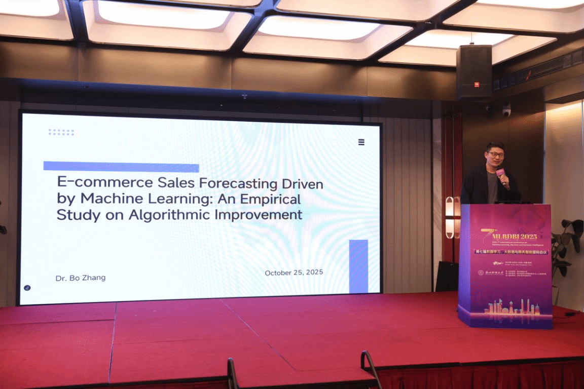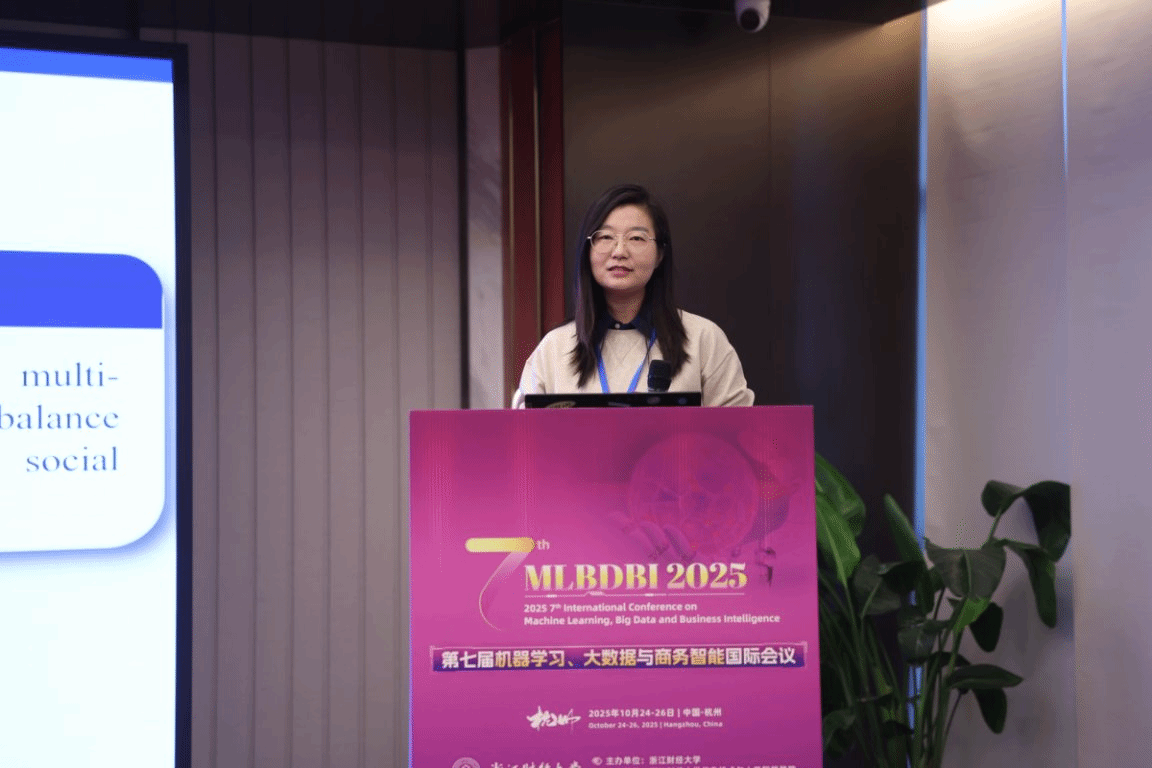 10月25日,经济与管理学院院长齐莉丽、电子商务系主任张波、副主任田怡参加了“2025 7th:international Conference on Machine Learning, Big Data and Business intelligence”国际学术会议,并作现场学术报告。此次汇报旨在展示学院教师在科研领域的最新进展,促进学术交流与合作,持续推动学院科研水平的提升。三位教师分别围绕用户行为分析、算法优化及绿色电商等前沿议题展开专题演讲。