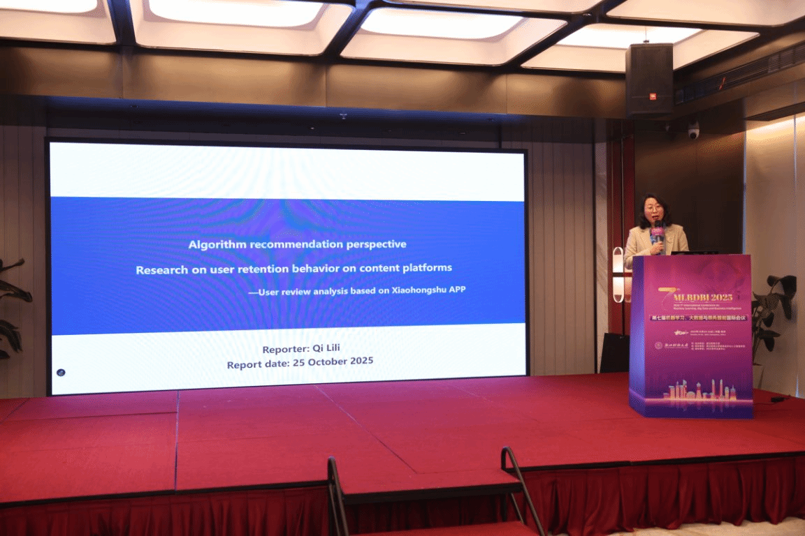 会上,齐莉丽以《Algorithm Recommendation Perspective Research on User Retention Behavior on Content Platforms —User Review Analysis Based on Xiaohongshu APP》为题进行报告。她基于“小红书”平台真实用户评论数据,综合运用TF-IDF、LDA主题模型与情感分析等文本挖掘方法,系统阐释了算法推荐对用户留存行为的影响机制,并就优化内容分发、增强用户信任及推动平台可持续发展提出对策建议。齐老师的报告内容详实、方法科学、逻辑严谨,获得评委与参会学者的高度评价,最终荣获本次会议“最佳汇报奖”。