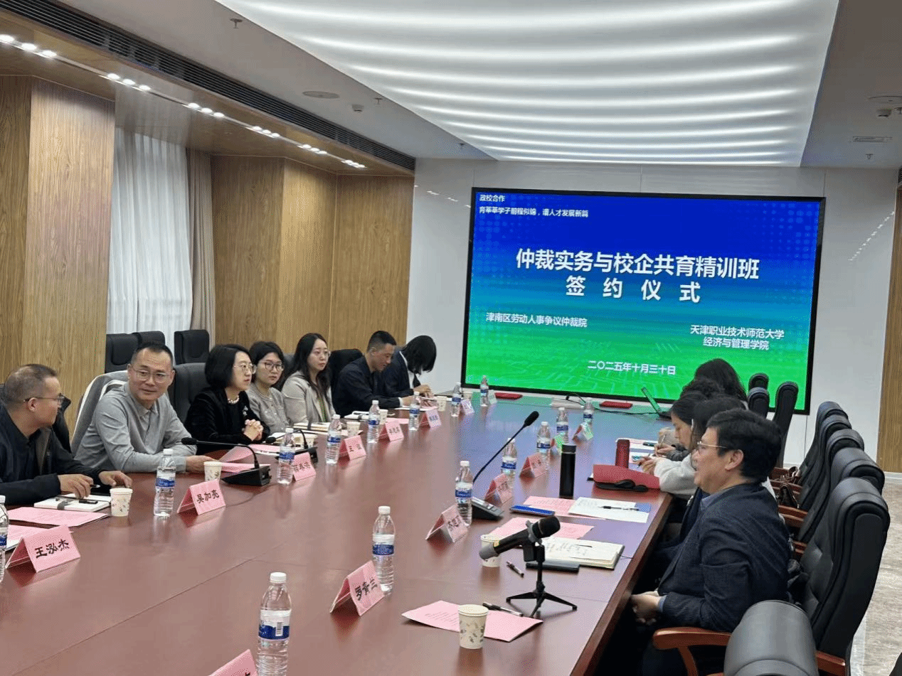 为深化产教融合、推动校地企资源共享与优势互补,10 月30 日下午 14:30,经济与管理学院与津南区劳动人事争议仲裁院举行签约仪式。津南区人力资源和社会保障局副局长薛春海,津南区劳动人事争议仲裁院院长王洹及仲裁院相关负责人,天津荣程钢铁集团、天津宏舜联合物业管理服务集团、天津津冠人力资源服务有限公司等企业代表,经济与管理学院院长齐莉丽,副院长齐旭高及学院师生代表共同出席仪式,仪式由经管学院副院长齐旭高主持。