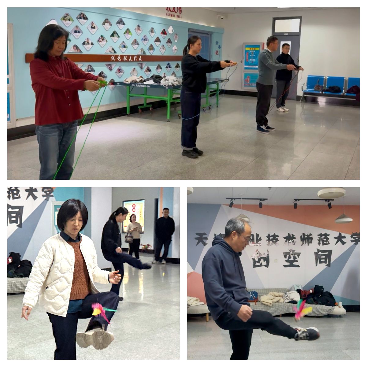 本次趣味运动会设置兼顾趣味性与参与性,设有健身球计时赛、筷子夹乒乓球接力赛、踢毽子计数、限时跳绳赛四个项目。现场氛围热烈而温馨,处处洋溢着团结奋进、其乐融融的景象。